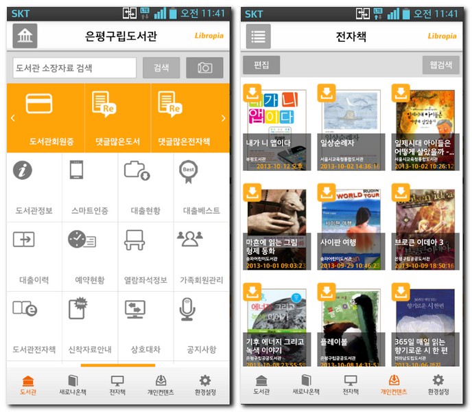 - 도서 예약, 반납연기, 대출현황, 대출이력, 예약현황 기능 제공