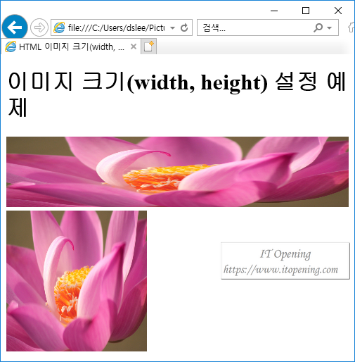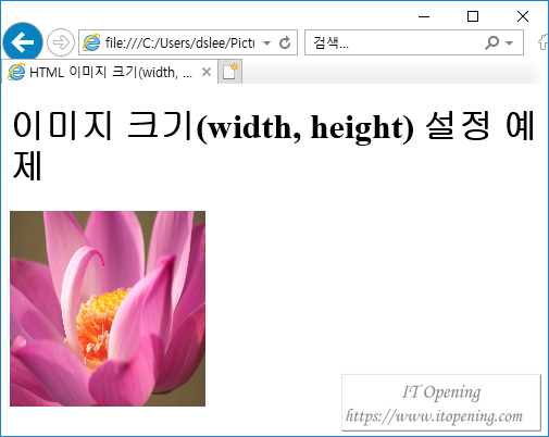 <img src="https://www.itopening.com/wp-content/uploads/2019/07/lotus-flower-1382251-638x425.jpg" alt="HTML 테스트 페이지로 이동" style="width:200px;height:200px;">