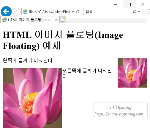 <p><img src="https://www.itopening.com/wp-content/uploads/2019/07/lotus-flower-1382251-638x425.jpg" alt="HTML 테스트 페이지로 이동" style="float:left;width:200px;height:200px;">오른쪽에 글씨가 나타난다.</p>