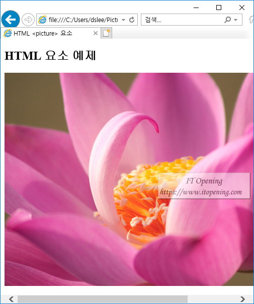 <img src="https://www.itopening.com/wp-content/uploads/2019/07/lotus-flower-1382251-638x425.jpg" alt="HTML 테스트 페이지로 이동" width="100" height="100">