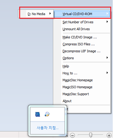 자! 이제 설치가 완료된 파일을 실행하면 윈도우 오른쪽 하단 작업 표시줄을 자세히 보자. 사람손모양으로 시디하나를 잡고있는 아이콘 보인다. 마우스를 가져다가 오른쪽 버튼을 눌러보자.