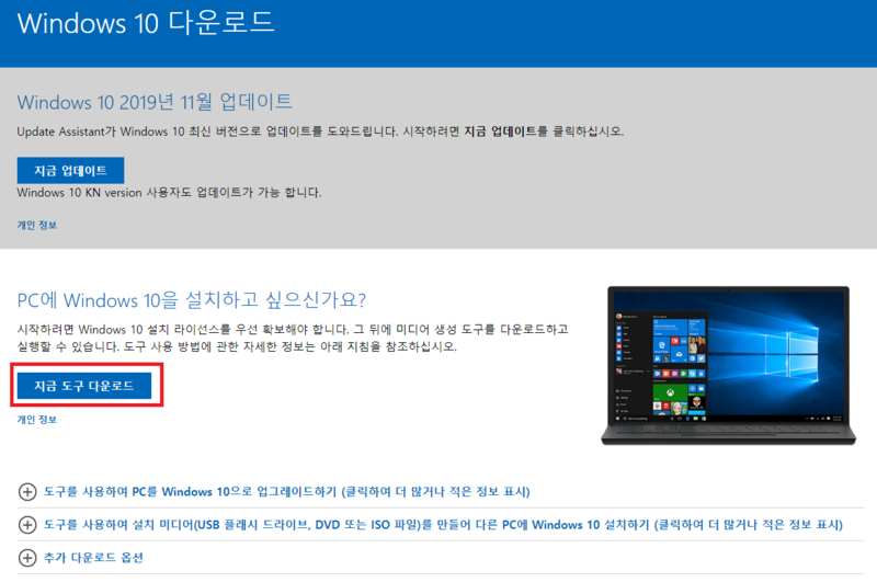 PC에 윈도우10을 설치하고 싶다면 [지금 도구 다운로드]라는 메뉴가 있는데, 클릭해서 다운로드 받는다.