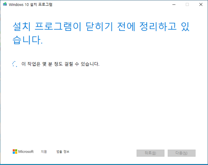 설치 프로그램이 닫히기 전에 정리하고 있습니다라는 메시지가 사라질때까지 기다려줘야 된다. 이 작업도 몇 분 정도 걸릴 수 있는데, 컴퓨터가 많이 느리다면 1분 ~ 2분정도 소요된다.