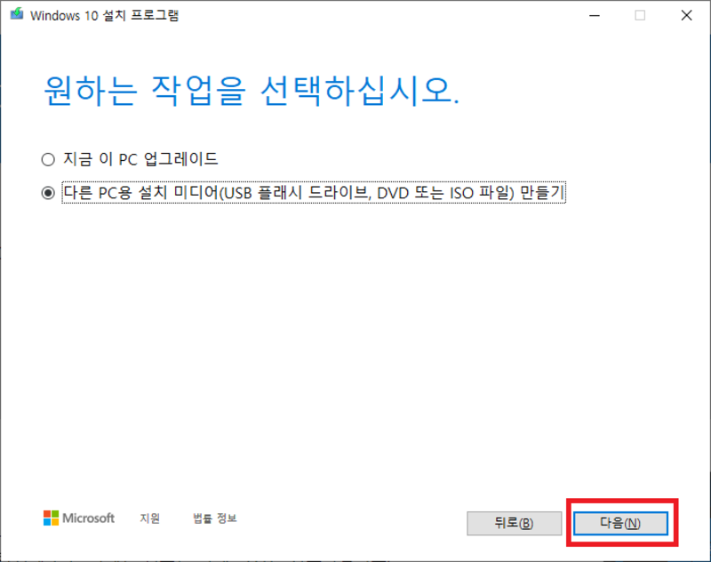 ISO파일을 만들기를 할 것이기 때문에 [다른 PC용 설치 미디어(USB플래시 드라이브, DVD 또는 ISO 파일)만들기]를 선택해서 다음 버튼을 클릭한다.