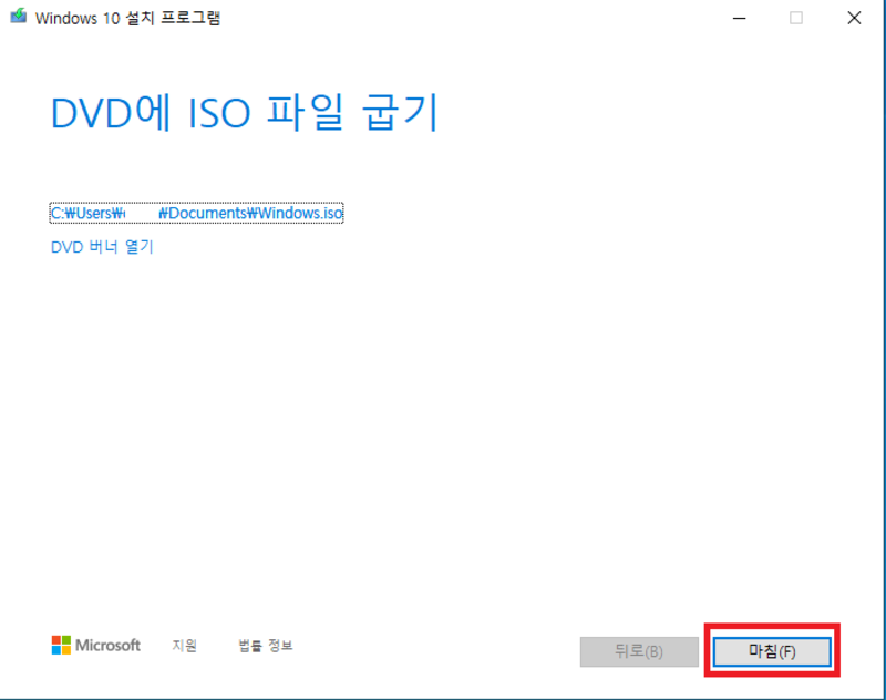 윈도우10 미디어 만들기가 완료되면, DVD에 ISO파일 굽기를 할 것인지를 묻는다. DVD버너 열기를 통해서 DVD레코딩을 할 수 있으며, DVD시디가 필요하다.