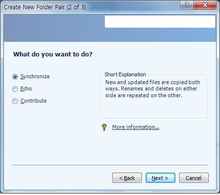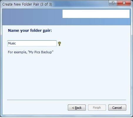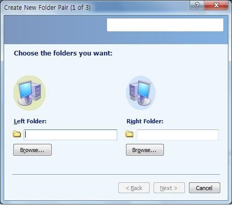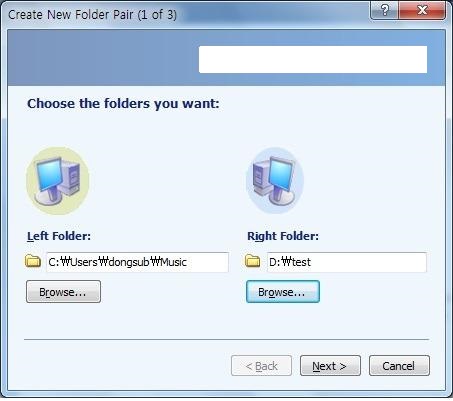 프로그램을 실행한후에 create Nwe Folder Pair 를 실행한다. 그럼 위의 그림 과 같이 나오는데, 동기화를 원하는 각각의 폴더 및 파티션(공유PC 등) 을 선택하게 된다.