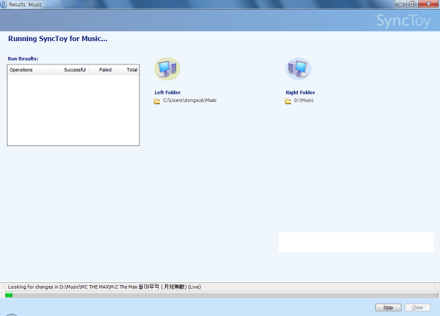 동기화가 진행되고 있는 모습이다. 일단 외장하드에 저장된 MP3 파일을 로컬 폴더로 동기화 진행중에 있다. 용량이 너무 커서 오랜시간이 걸릴것으로 예상된다.