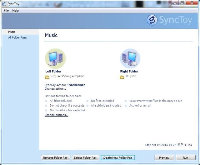 그럼 양 옆으로 선택된 폴더가 나타나게 된다. 그리고 Run 을 선택하게 되면 동기화가 진행이 된다.