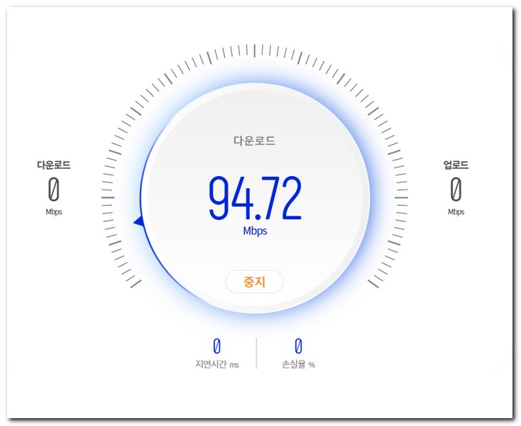 그럼 실시간으로 속도 측정을 진행하게 된다. 현재 속도를 보니 94.72Mbps정도 속도가 나온다. 다운로드 속도 업로드 속도 지연시간 손실율 까지 모두 표시 된다.