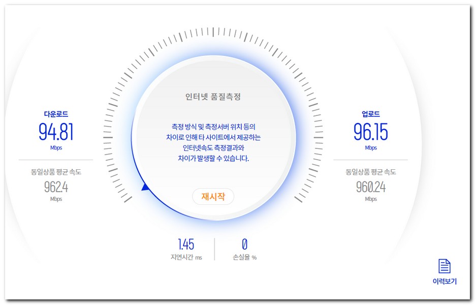 필자의 경우 다운로드 속도는 94.81 정도 나왔다. 동일상품평균속도가 962.4Mbps정도인 것을 보면 한참 못미친다. 업로드 속도는 오희려 더 높다. 96.15Mbps정도 나왔다.