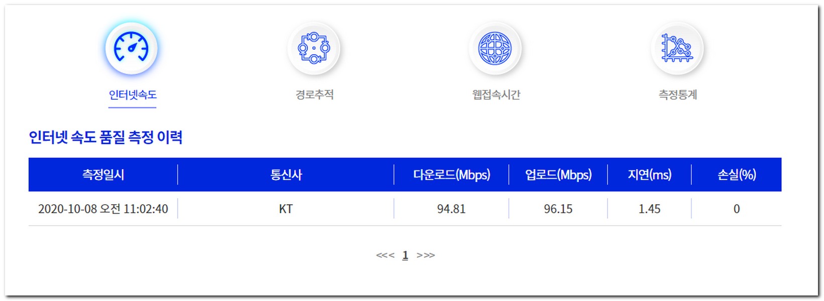 그럼 다시 인터넷 페이지로 이동한다. 한국전산원 공식홈페이지에서 아까전에는 제대로 인터넷 속도테스트가 안되었지만 이젠 정상적으로 속도 측정이 가능해졌다.