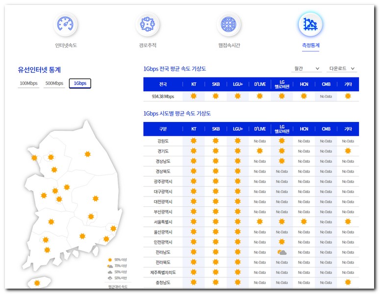 추가적으로 측정통계를 통해서 유선인터넷 속도에 따른 전 지역의 평균속도를 확인할 수 있다. 전반적으로 속도가 양호한 편이다.