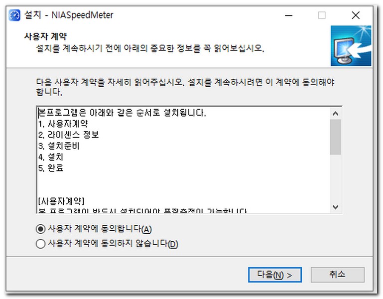 설치에 앞서 기본적인 사용자 계약에 대해서 물어본다. 사용자계약, 라이센스 정보, 설치준비, 설치, 완료의 순서대로 진행될 것이다. 사용자 계약에 동의합니다는 선택한다.