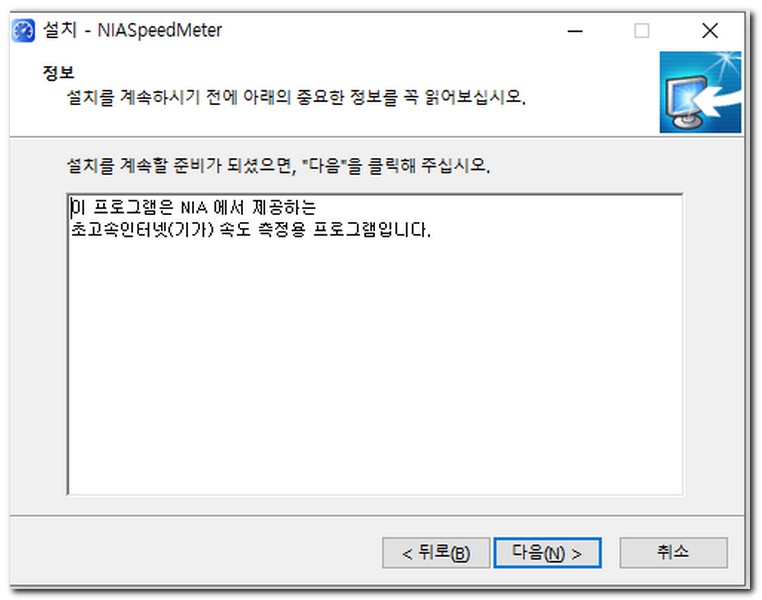 프로그램 설명에 대해서 간단히 물어본다. nia에서 제공하는 초고속인터넷(기가 gia)속도 측정용 프로그램이다.