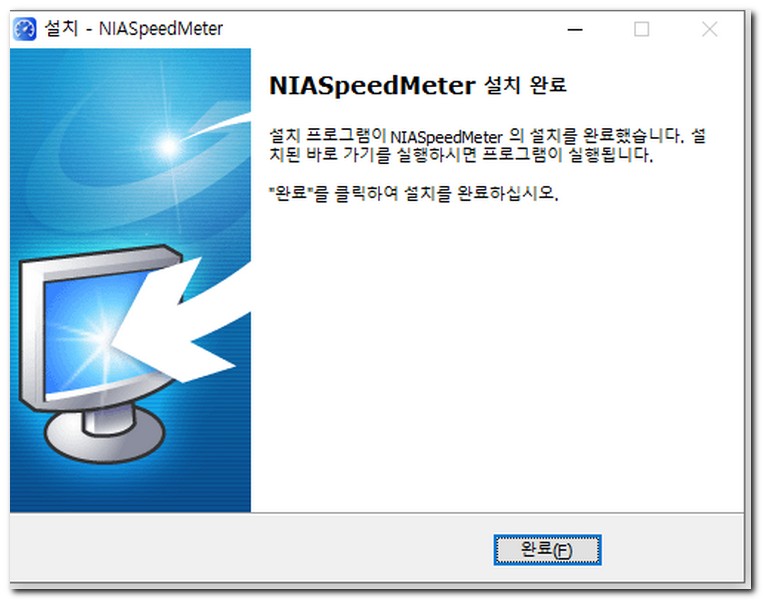 설치 프로그램 NIASpeedMeter의 설치가 완료되었다. 설치된 바로 가기를 실행하게 되면 프로그램이 자동으로 실행 된다. 완료 버튼을 클릭해서 설치를 최종적으로 완료한다.