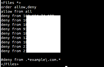 그리고 deny from 부분에 차단하고 싶은 ip를 입력 해준다. 만약 도메인을 등록하고 싶으시면 .example.com. 식으로 입력해주시면 된다.