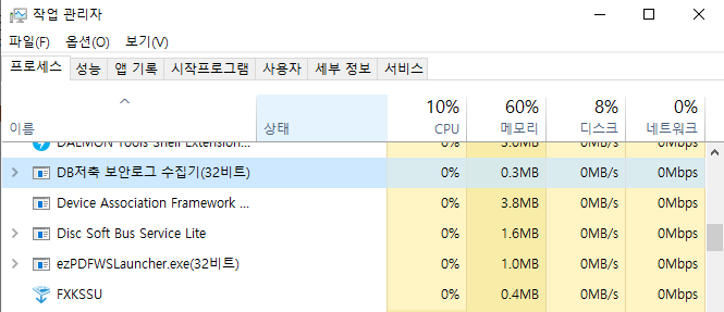 중지 방법 : 작업 표시줄 -> 작업 관리자 -> 세부 정보 -> DB저축 보안 로그 수집기 -> 작업 끝내기