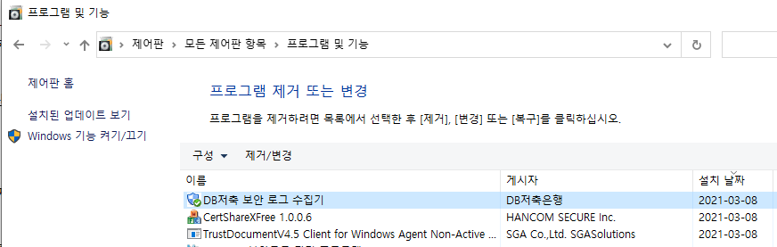 삭제 방법 : 제어판 -> 모든 제어판 항목 -> 프로그램 및 기능 -> DB저축 보안 로그 수집기 -> 제거/변경