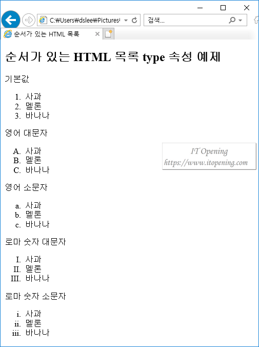 <h2>순서가 있는 HTML 목록 type 속성 예제</h2>