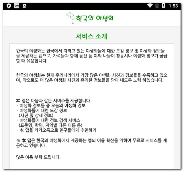 한국의 야상화 앱은 한국에서 자라고 있는 야생화들에 대한 도감 정보 및 야생화 정보들에 대해 제공해주는 앱이며, 가족들과 함께 등산이나 야외 나들이 활동시나 야생화 정보가 궁금할 경우 유용하게 사용하면 된다.