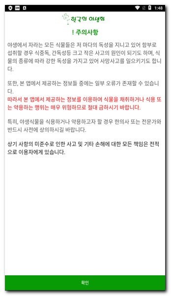 앱을 사용하기에 앞서 야생에서 자라는 모든 식물들은 저 마다의 독성을 지니고 있기 때문에 함부로 섭취할 경우 식중독이나 간독성등 크고 작은 사고의 원인이 발생한다.