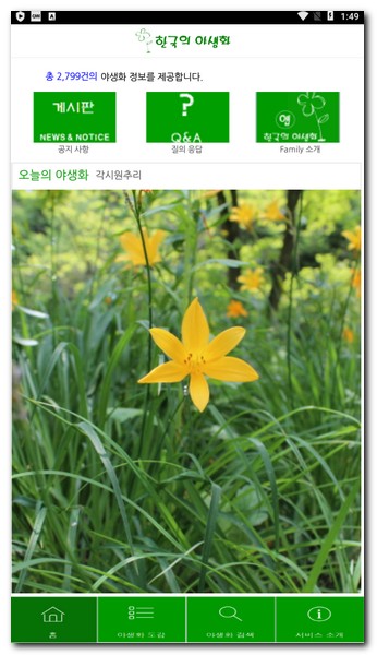 야생화 정보들 중 오늘의 야생화 정보를 확인해볼 수 있으며, 야생화들에 대한 도감정보를 사진이나 상세 정보형태로 확인이 가능하다.