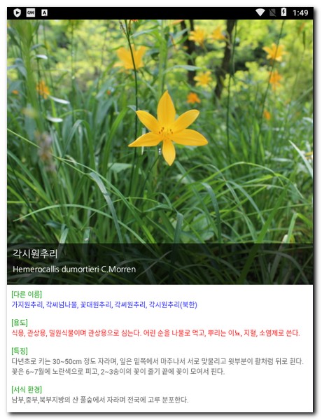 필자의 경우에는 현재 식물도감 어플을 설치하지 않은 상태이기 때문에 설치버튼이 활성화 되어 있다. 우리나라 산과 들 또는 공원에서 자라는 야생화들에 대한 도감 정보와 함께 이름 지역별 이름을 상세조회할 수 있다.