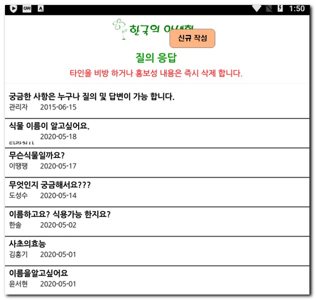 보다 자세한 식물들에 대한 질문사항을 올리고 싶다면 질의 응답 게시판을 이용하면 된다.