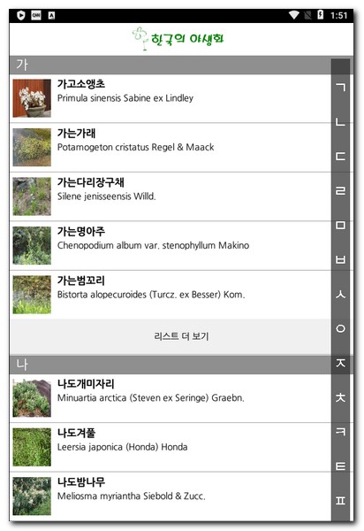 한국의 야생화를 세부적으로 검색해봤다. ㄱ ~ ㅍ 까지 카테고리별로 리스트가 정리되어 있다. 가고소앵초, 가는가래, 가는다리장구채, 가는명아주, 가는범꼬리, 나도개미자리, 나도겨풀, 나도밤나무 등이 보인다.
