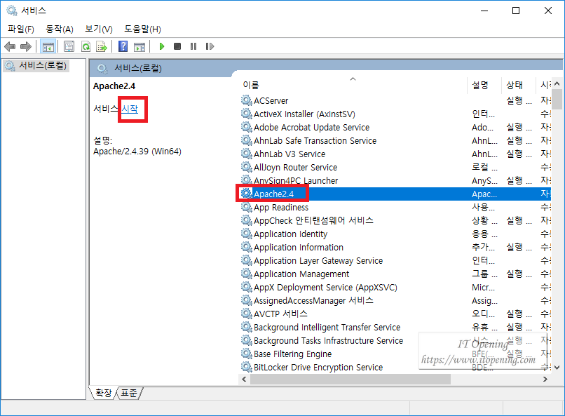 Apache2.4 서비스를 선택해서 "시작"을 눌러준다.