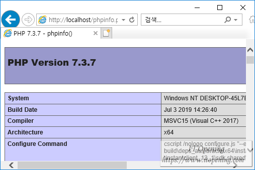 사진과 같이 PHP Version 7.3.7 이라는 제목이 나타나면 apache + php 연동 설치가 완료된 것이다.