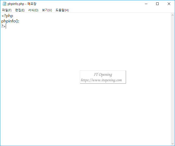 위 경로로 이동해서 phpinfo.php 파일을 만들고, 메모장을 이용해서 아래 코드를 입력한다.