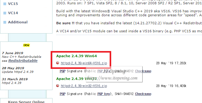 64비트 환경이라면 "Apache 2.4.39 Win64" 버전을 다운로드 받는다.