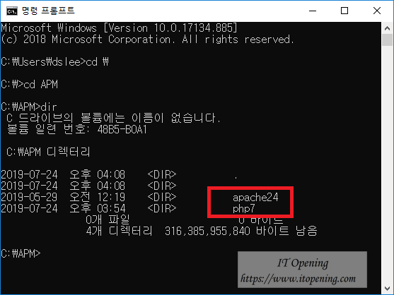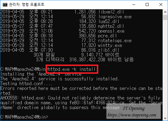 C:\APM\apache24\bin 경로로 이동해서 아래와 같이 설치 명령을 입력한다.
