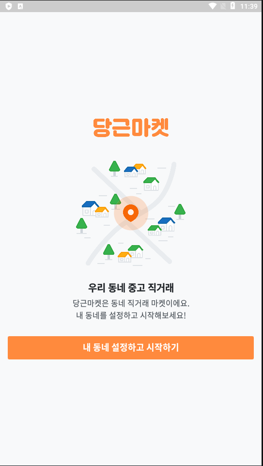 유랑마켓(당근마켓) 앱을 실행하게 되면 첫번째로 해야될 것이 내 동네 설정하고 시작하기를 해야 된다.