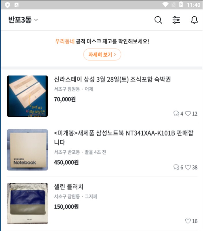 마지막으로 회원가입 및 로그인이 완료되면 우리동네 중고 물품을 한 번에 확인할 수 있게 된다.