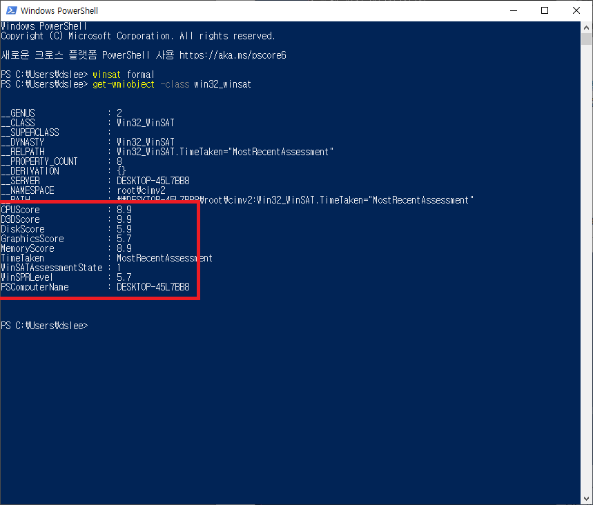 명령프롬프트창이 닫히게 되면, 위와 같은 명령어를 입력해준다. 그럼 시스템 성능 평가 점수인 체험지수의 결과값이 나타나게 된다. 9.9점이 가장 높은 점수를 뜻한다.