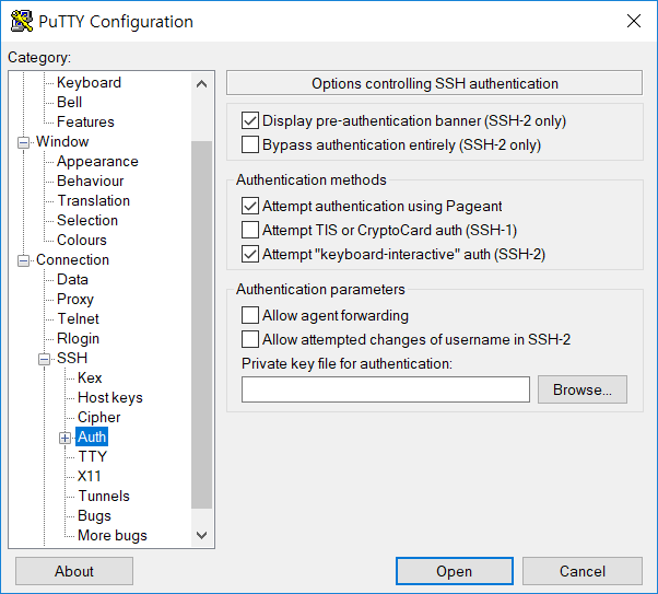putty를 실행하고 [connection -> Auth]를 선택한다. 왼쪽 하단에 있는 [Private key file for authentication -> Browse 클릭]해서 파일 불러오기한다.