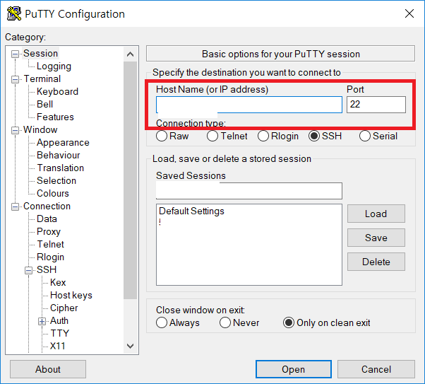 마지막으로 [Session -> Hostname]선택. 접속하고 싶은 서버 호스트네임이나 IP를 입력해준다.