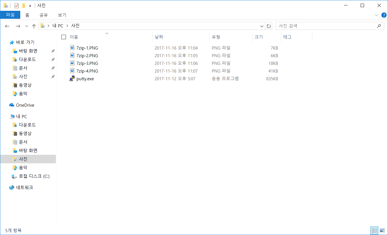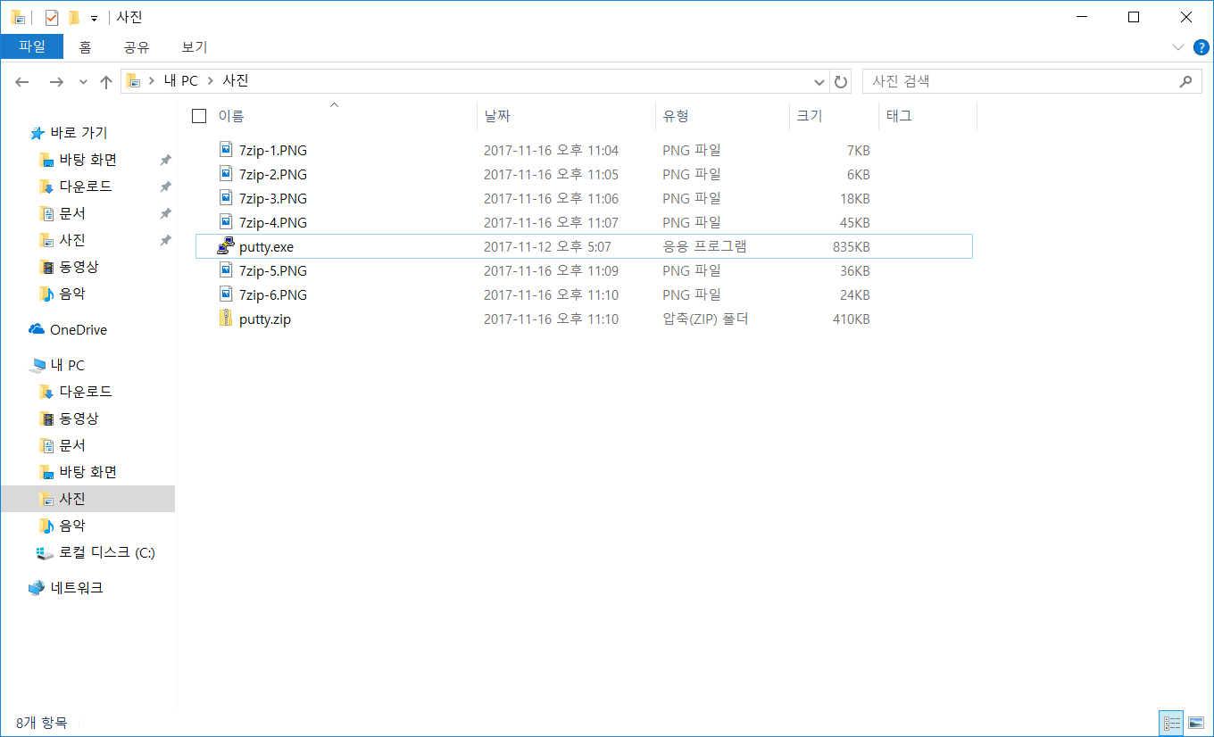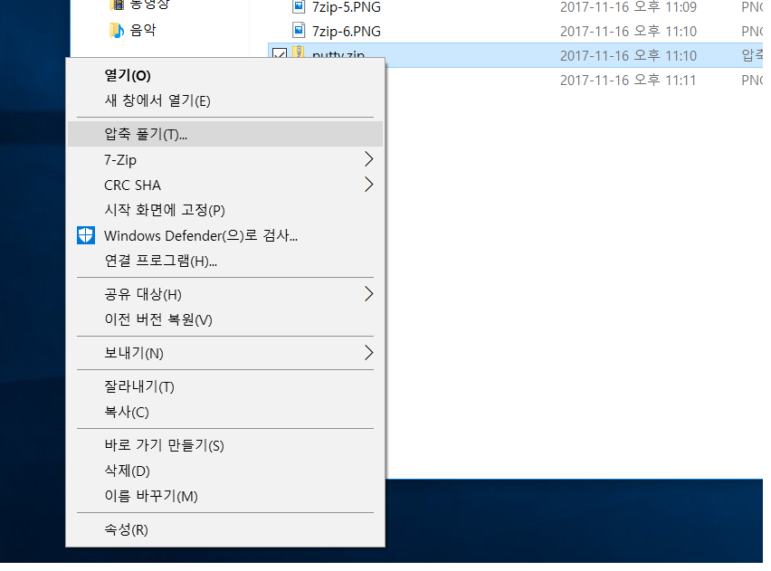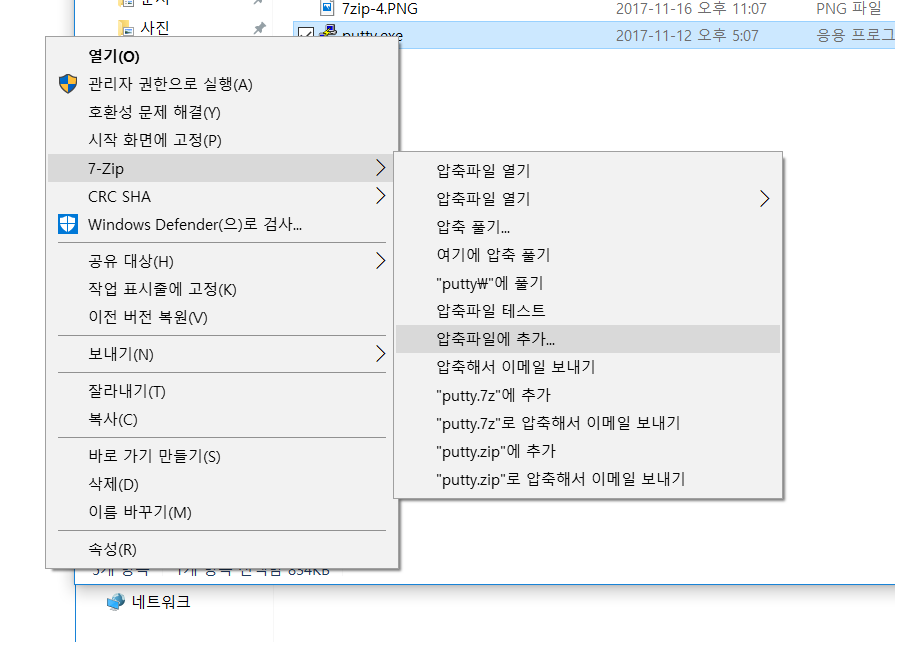일단 윈도우10 탐색기에서 작업해보겠다. 필자는 putty.exe 파일을 zip 파일로 압축할 것이다.