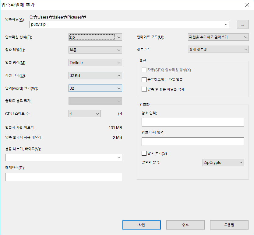 그럼 화면처럼 파일 압축 옵션이 나타나게 되는데, 압축파일 형식(F)에서 zip 형식으로 변경한 후에 '확인' 버튼을 클릭한다.