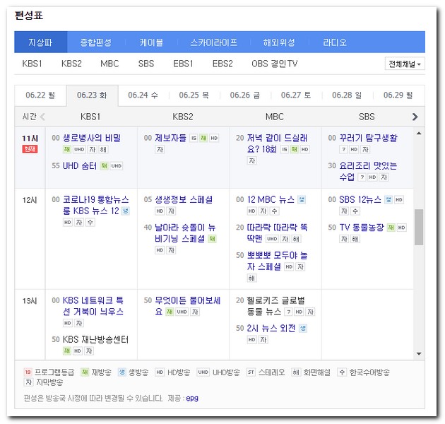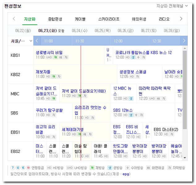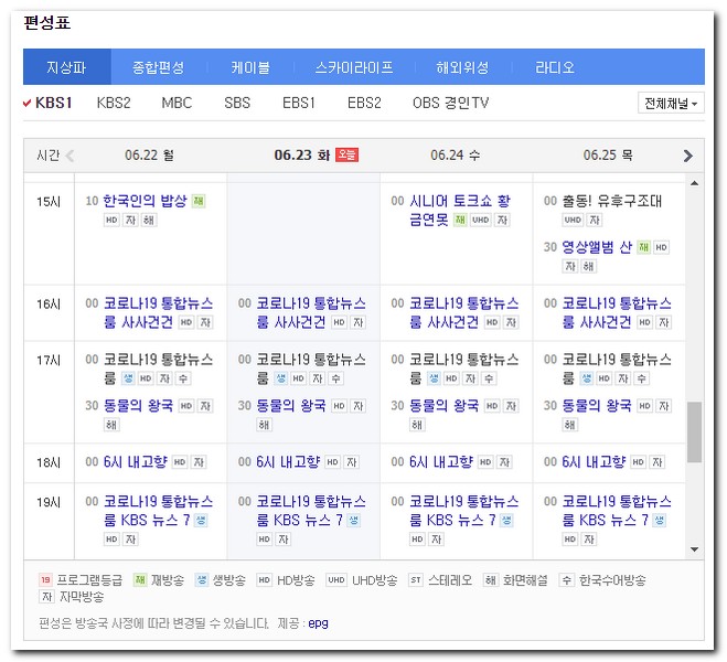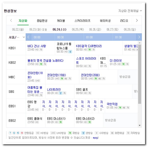 채널 편성표 하단 메뉴를 참고해보면 프로그램 등급표와 함께 재방송, 생방송, hd방송, uhd방송, 스테레오 방송, 화면해설, 한국수어방송, 자막방송으로 제공되고 있다는걸 확인이 된다.