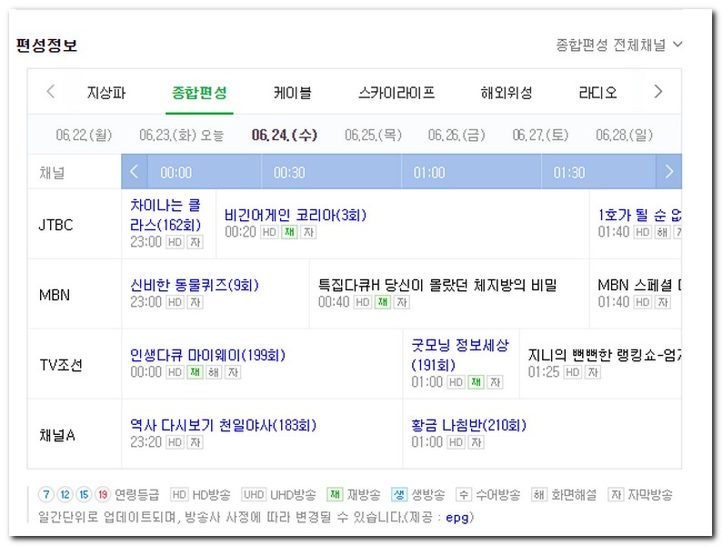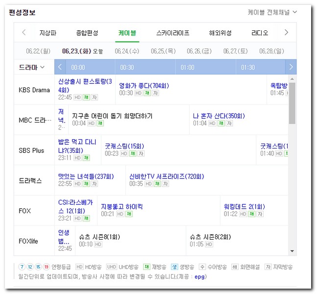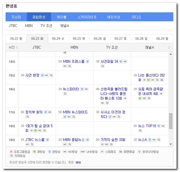 단순히 지상파 편성표만 확인할 수 있는것이 아닌, 종합편성표, 케이블 채널 편성표, 스카이라이프 채널편성표까지 모두 확인이 가능하다.