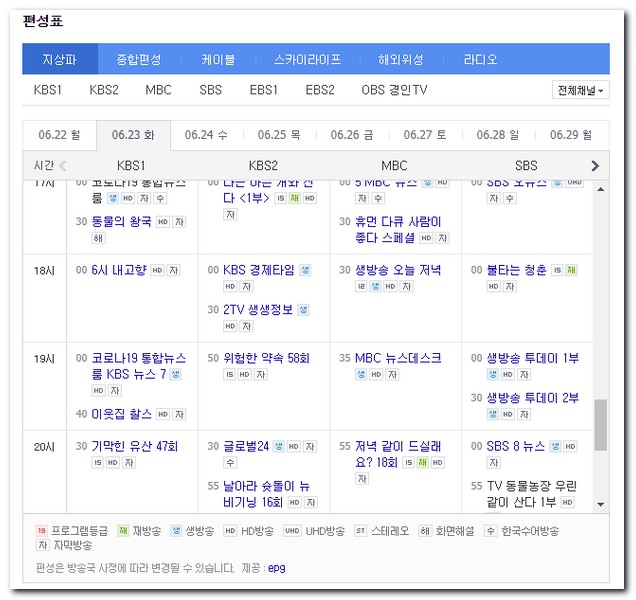 다음 날 시간대별 지상파 편성표와 함께 주간별 편성표 시간대를 모두 확인할 수 있다. 바다 건너 사랑, 코로나19통합뉴스룸, KBS걸작 다큐멘터리, 생활의 발견, 불후의 명곡 전설을 노래하다, 나이트라인, SBS골프, EBS클래식등이 확인하였다.