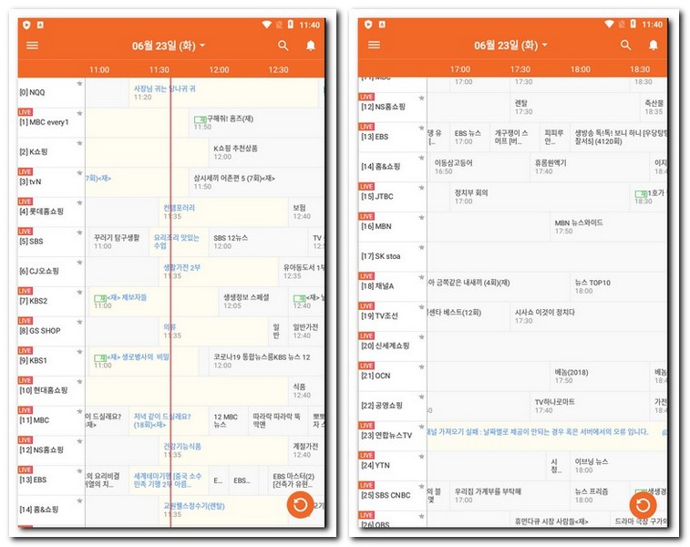 mbc dmb, sbs dmb, kbs dmb, jtbc dmb, tvn 채널 편성표까지 한 번에 확인이 가능한데, 금일 날짜 기준으로 시간대와 해당 시간대에 재상송인지 생방송인지 어느채널에서 방송되는지 세부적으로 확인할 수 있다.