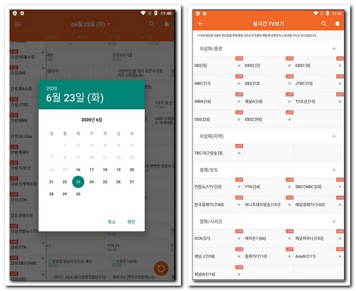 스마트폰 어플(앱)을 다운로드 받아 설치해서 사용하는 방법들도 존재한다. 티비의 달인이라는 앱인데, 무료 tv실시간 시청이 가능하면서 티비 채널 편성표도 한 번에 확인이 가능하다.