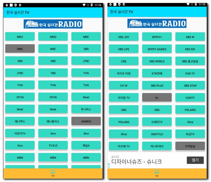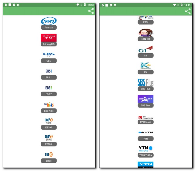 한국실시간TV앱을 설치해서 다운로드 받았는데, 시청가능한 플레이 리스트들이 상당히 많이 존재했다. KBS1, KBS2, MBC, SBS, JTBC, TBS, TVN, OTVN, 투니버스, 애니박스, TV조선, 어린이TV 등 채널 종류가 굉장히 많다는 장점이 있다.