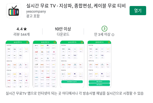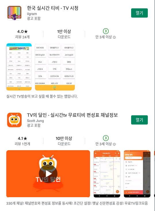 우선 구글 플레이스토어에 접속을 해도 되고, 사진 내용을 참고해도 상관없다. 실시간 무료 TV 지상파, 종합편성, 케이블 무료 티비를 선택해서 다운로드 받아도 된다.
